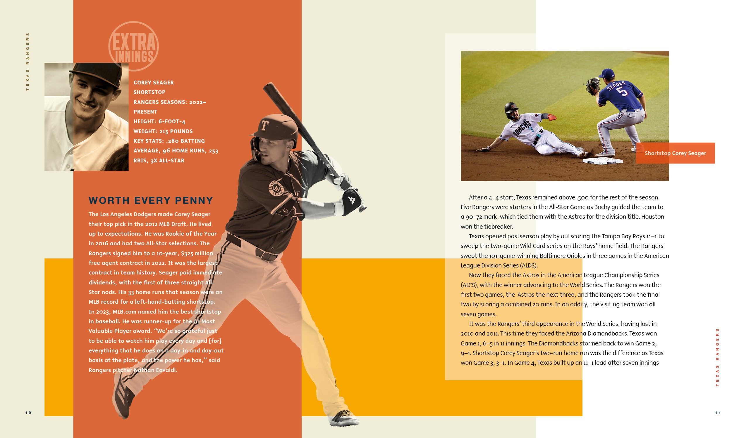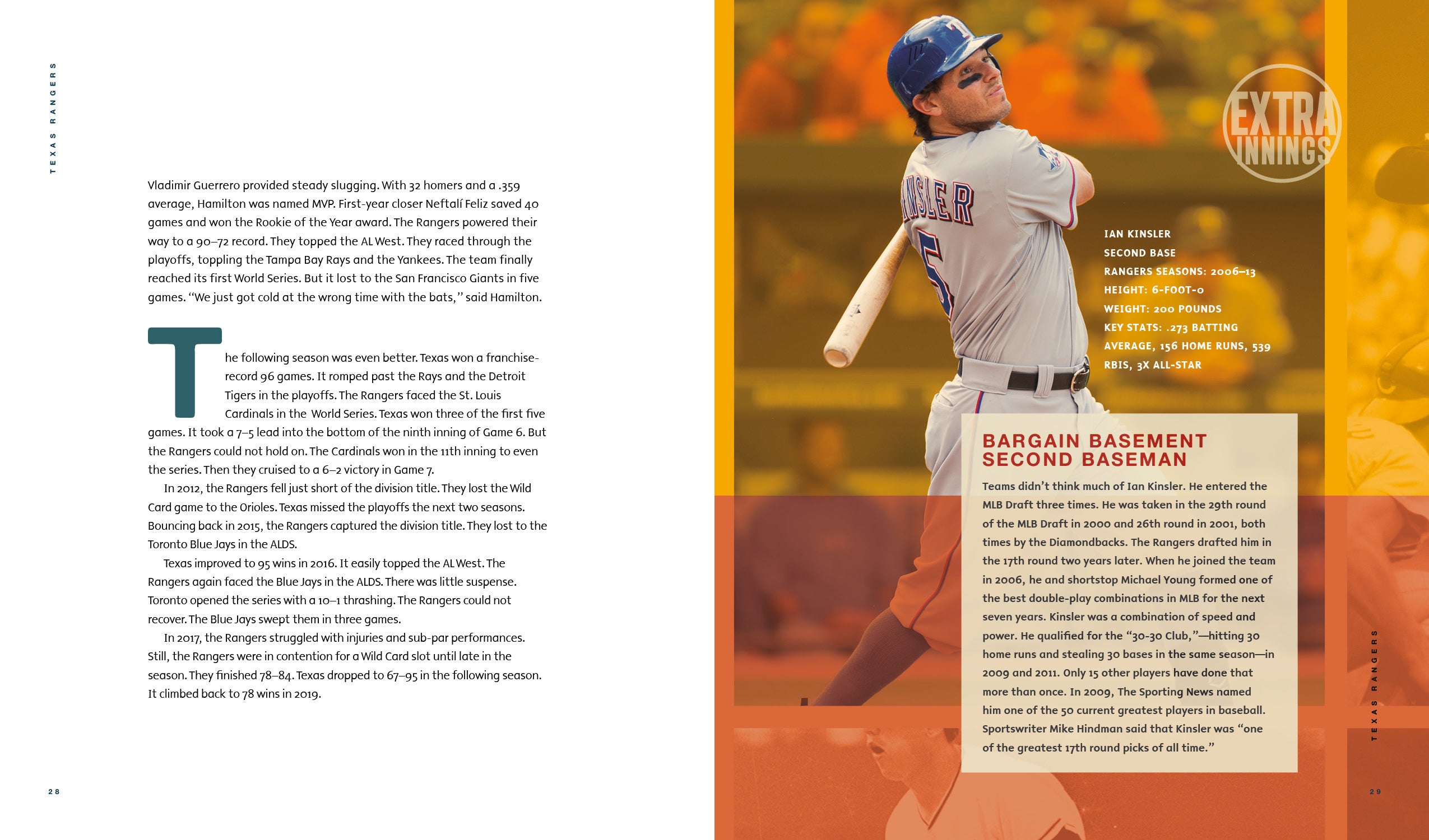 Journey with the Texas Rangers team through their highs and lows in Major League Baseball from their origins as the Washington Senators to their move to Texas. Written for middle-grade sports fans, this book highlights their first playoff appearance in 1996, the back-to-back World Series losses in 2010 and 2011, and their first World Series title in 2023. Notable players like Iván Rodríguez, Nolan Ryan, and Corey Seager are featured. The Rangers' journey is marked by resilience, star power, and a dedicated fan base, with recent triumphs offering hope for future success. Includes table of contents, sidebars, and index.