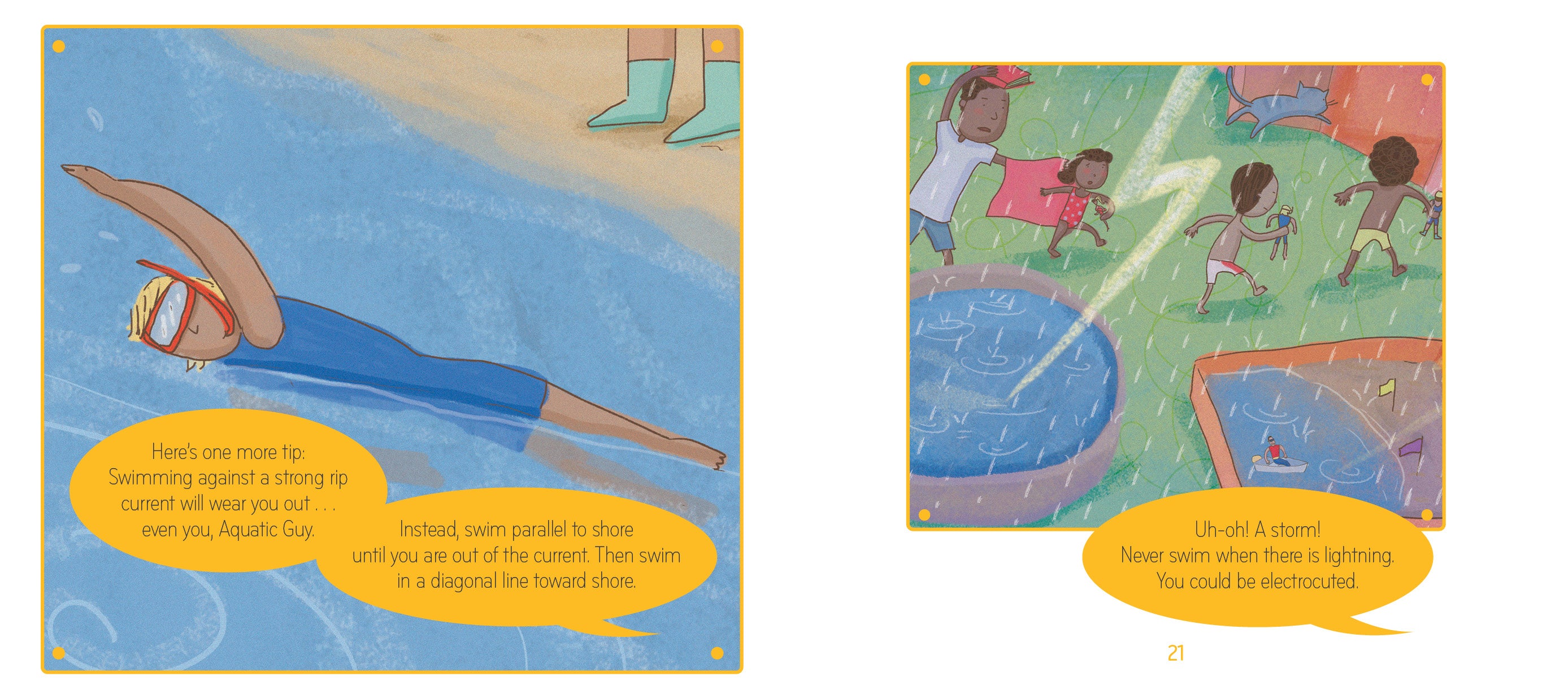A young boy teaches his superhero action figures the water safety rules he has learned. Covering lifeguards, swimming lessons, diving, boating safety, and more, this illustrated fiction story for grades K–2 uses humor to reinforce the importance of water safety. Includes safety tips, glossary, and resources for more information.