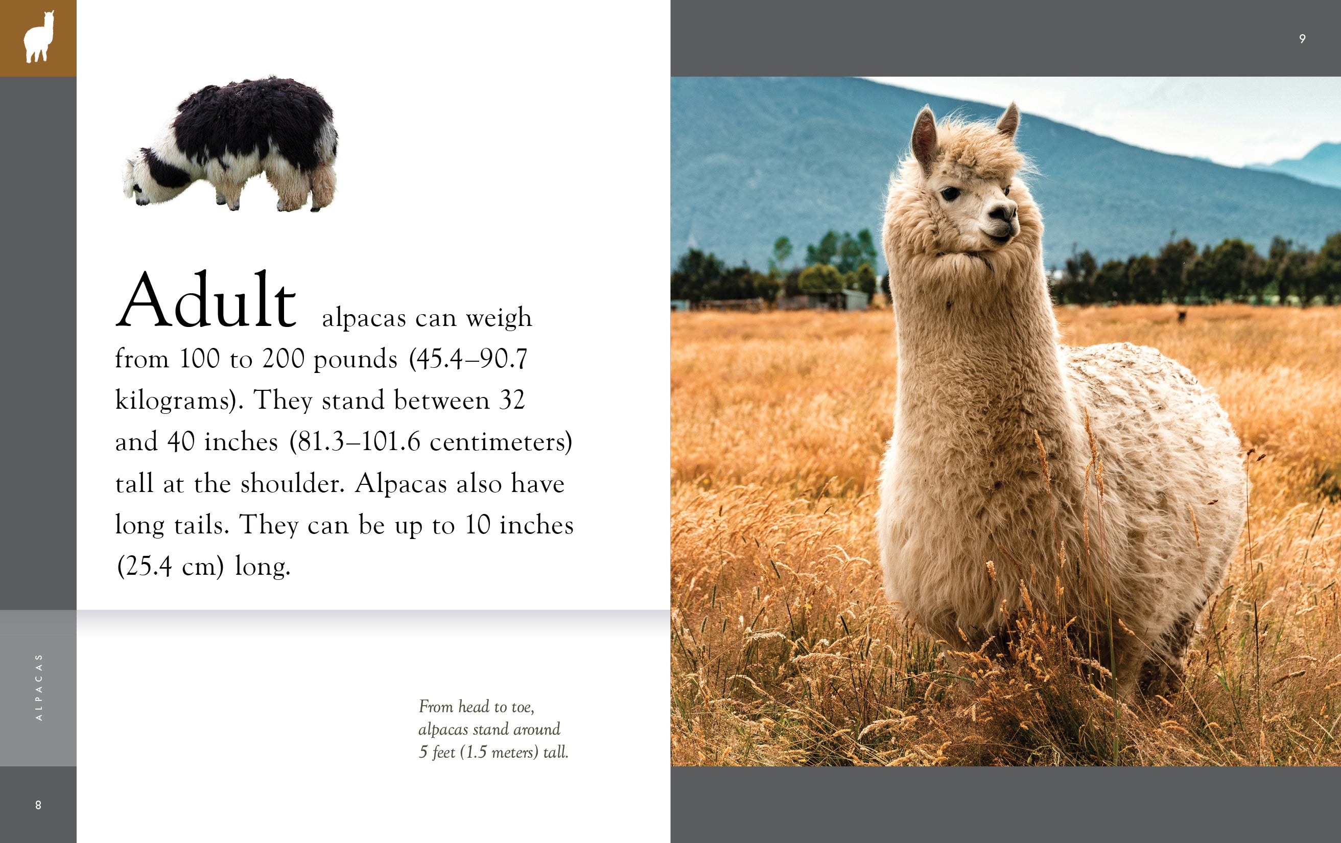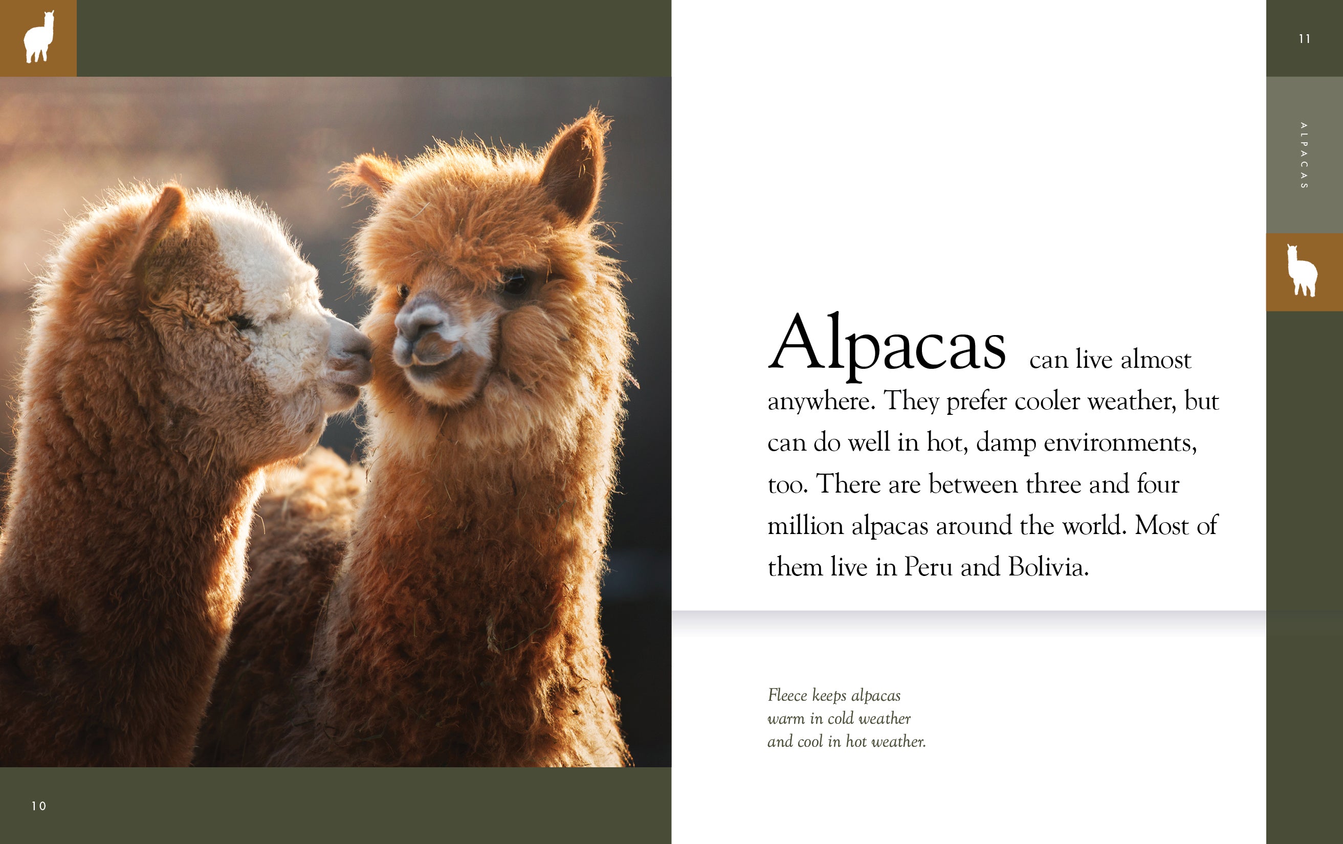 With their fluffy fleece and long necks, alpacas fascinate young children. This zoology title, filled with beautiful photos and factual life science text, provides an engaging overview of alpacas, members of the camelid family. The text details their physical characteristics, habitat preferences, diet, social behaviors, breeding habits, and life cycle. It includes a cultural story from Peru about the significance of alpacas. Part of Creative Education’s popular Amazing Animals series, this book supports elementary-aged readers with captions, on-page definitions, additional resources, and an index.