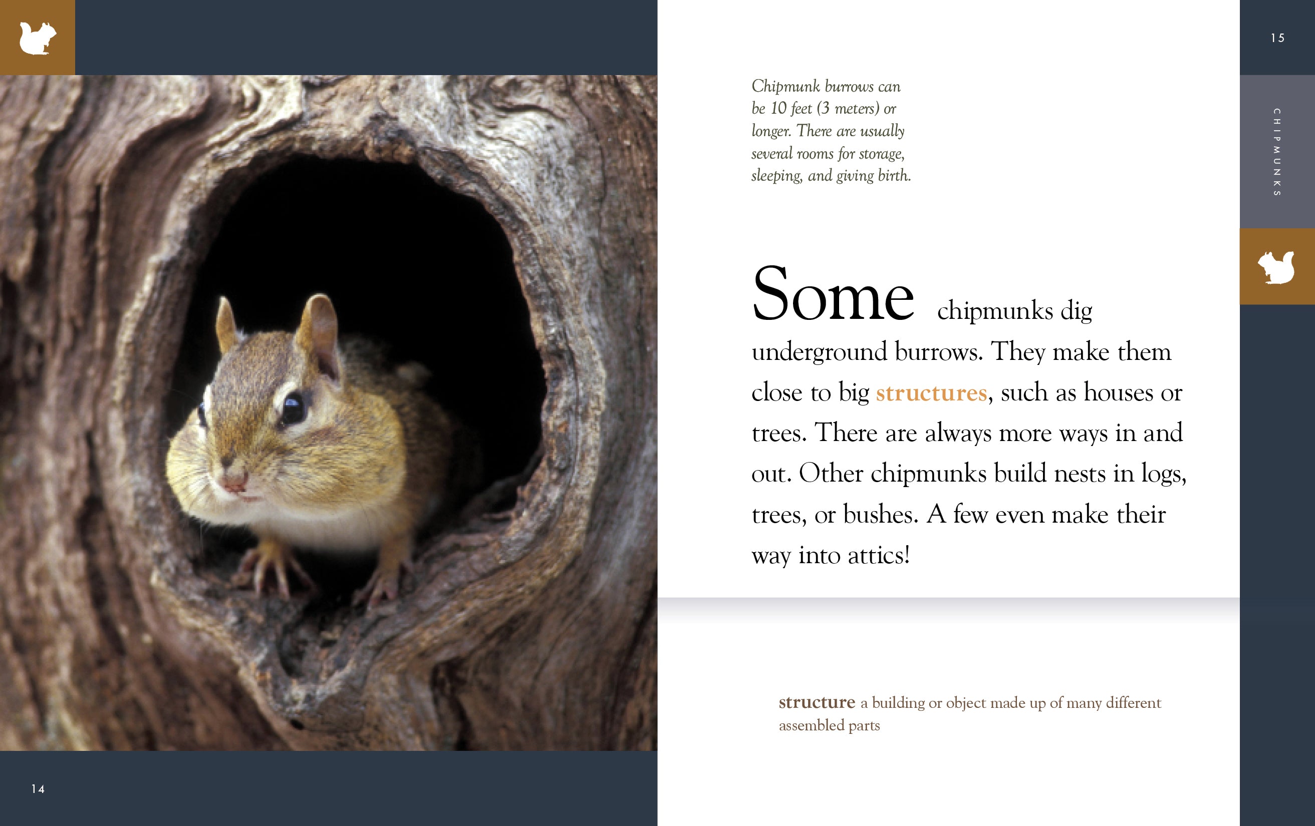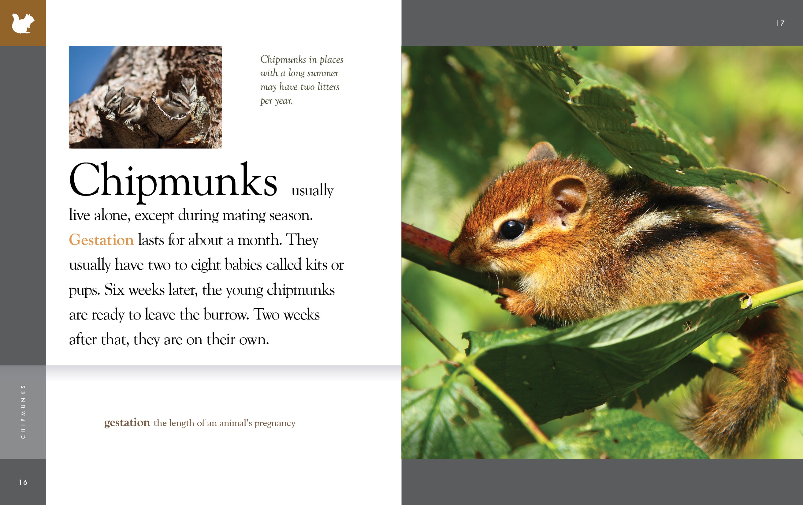 With their dark-striped reddish-brown fur and cheek pouches for carrying food, chipmunks are fascinating creatures. This zoology title, filled with beautiful photos and factual life science text, provides an engaging overview of these small rodents. It describes their physical characteristics, habitat, diet, and behaviors, explaining their solitary nature, mating habits, and the process of torpor during winter. The book includes a cultural tale from the Haudenosaunee people about how the chipmunk got its stripes. Part of Creative Education’s popular Amazing Animals series, the book supports elementary-aged readers with captions, on-page definitions, additional resources, and an index.