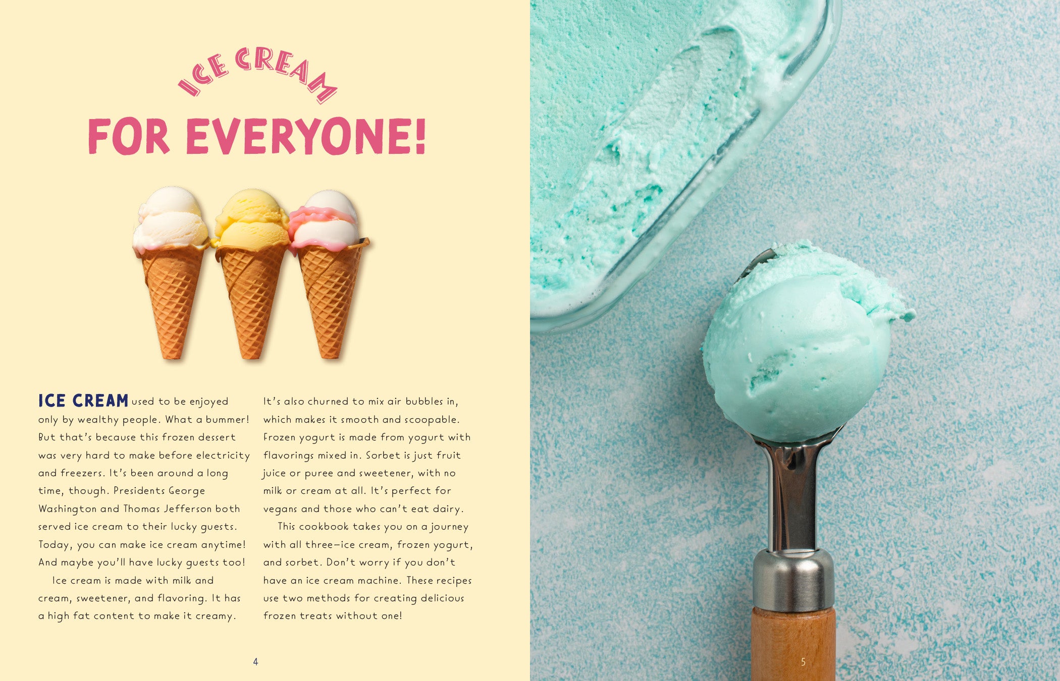 Simple homemade ice cream recipes for tweens and teens inspire kids to experiment in the kitchen. This delightful guide for young ice cream enthusiasts features a variety of easy-to-follow recipes for ice cream, frozen yogurt, and sorbet, including vanilla and chocolate ice cream, blueberry froyo, and s'mores ice cream pie. The cookbook provides step-by-step instructions, safety tips, a glossary of cooking terms, and tips for hosting a party. Perfect for budding chefs who want to explore the world of frozen desserts!
