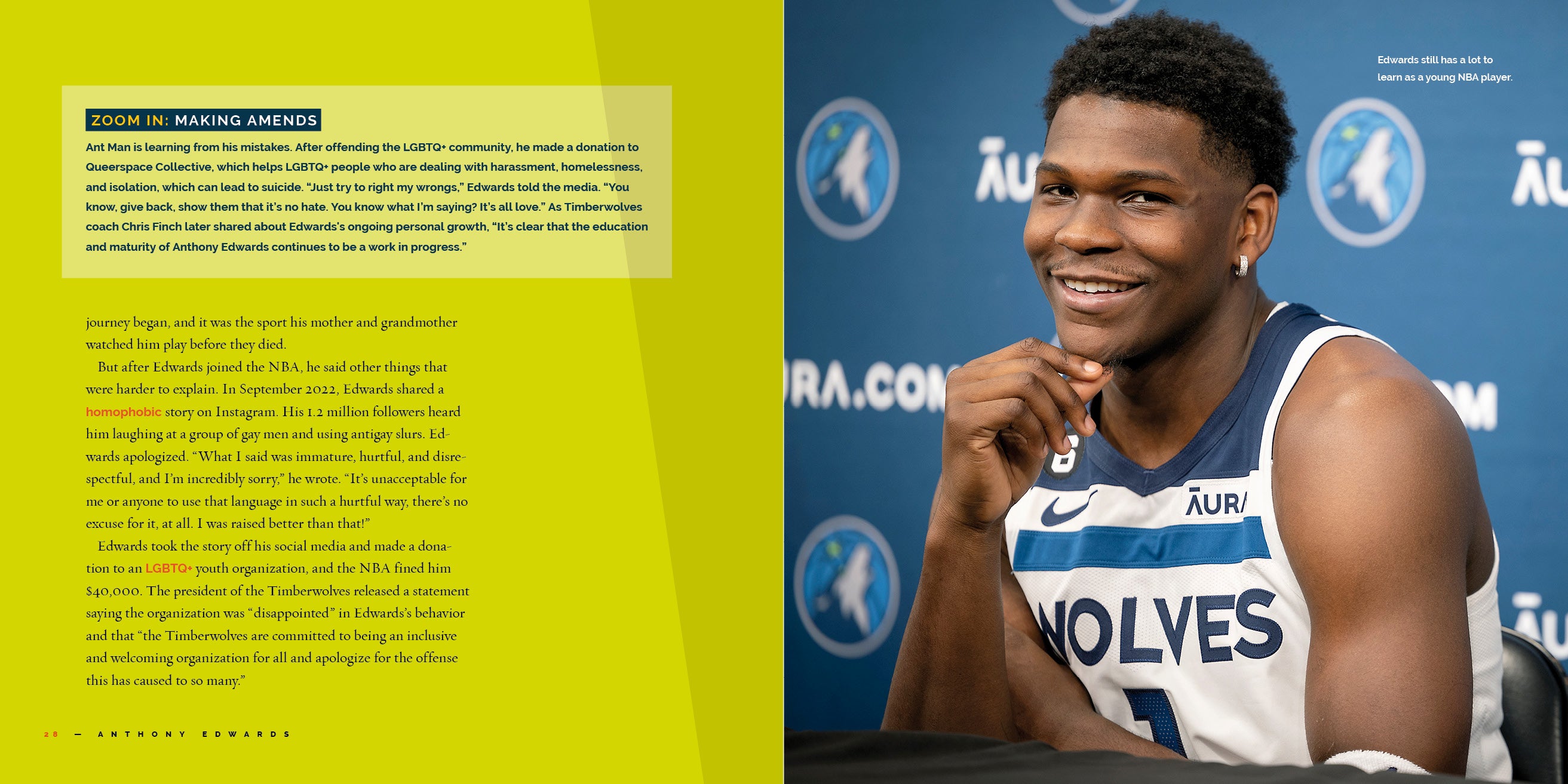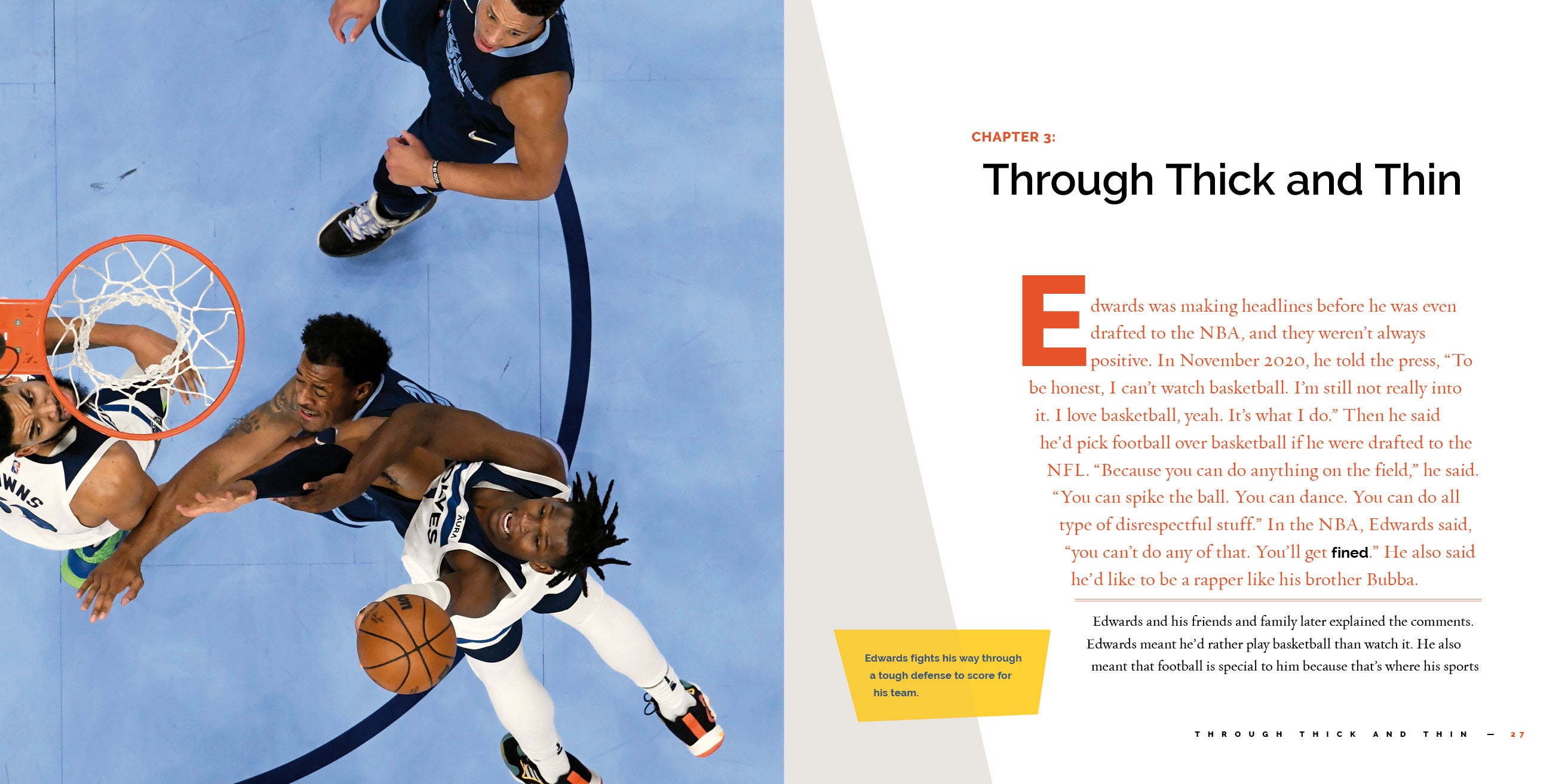 Meet basketball star Anthony Edwards in this illuminating biography written for middle-grade readers. Following his athletic prowess, particularly in basketball, this book chronicles his advancement through high school and college to his selection by the Minnesota Timberwolves. Through personal challenges, including the loss of his mother and grandmother, Edwards has dedicated himself to making them proud on-court and off-court in his commitment to giving back to the community. Edwards' story is one of resilience, hard work, and the pursuit of greatness. Includes table of contents, sidebars, glossary, resources, and index.