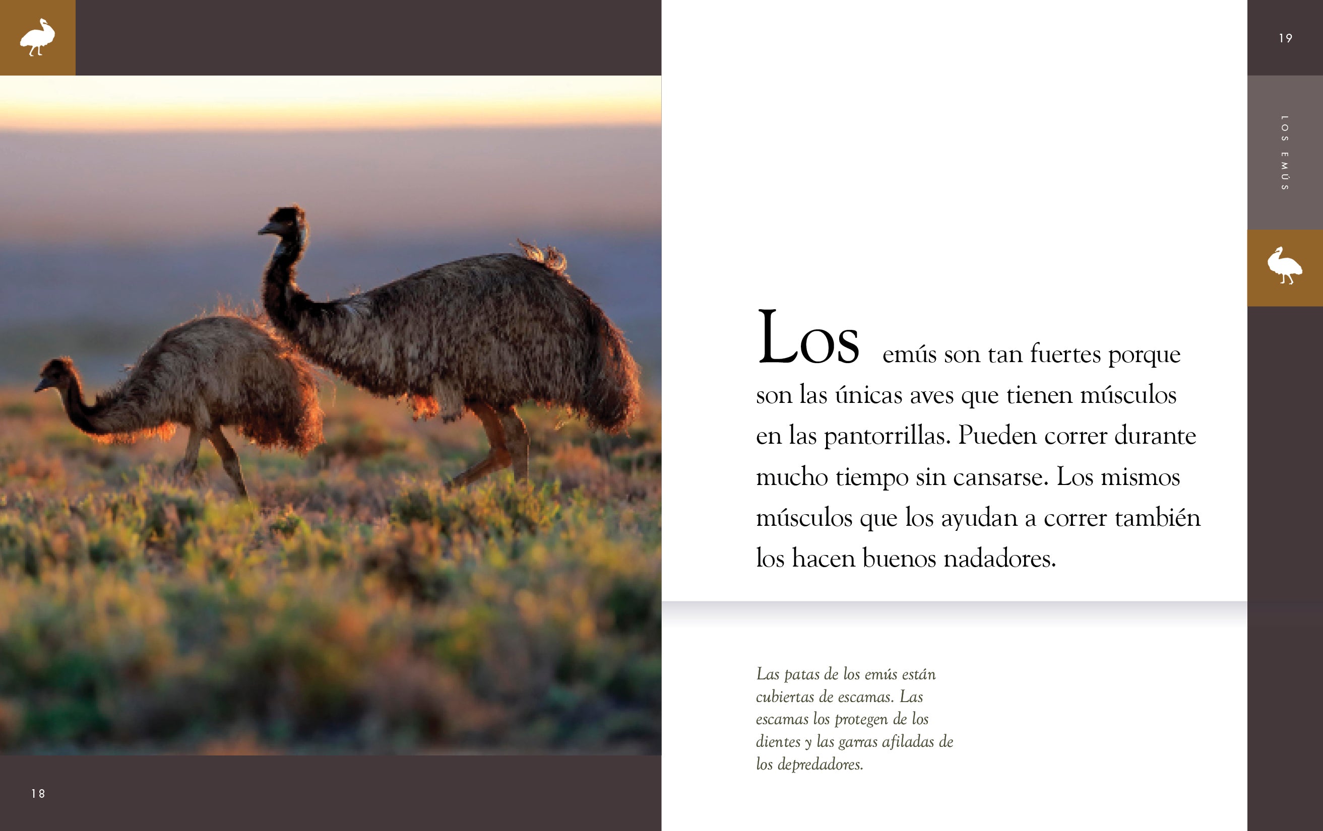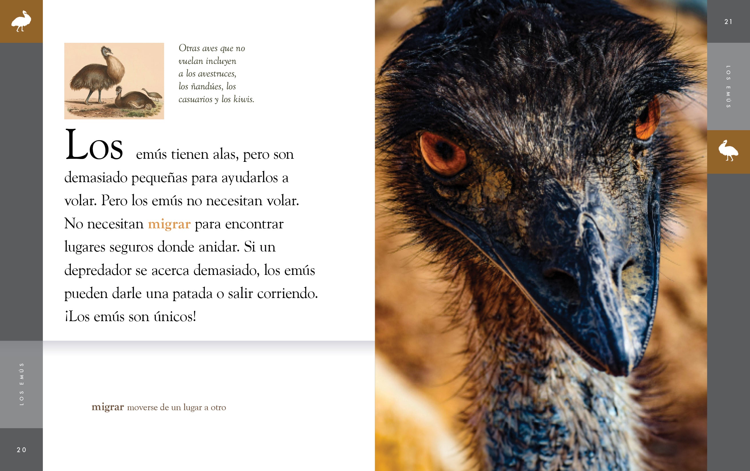 Con características físicas como patas largas y plumas desgreñadas y la capacidad de correr a altas velocidades, los emús fascinan a los niños pequeños. Este título de zoología, lleno de hermosas fotos y texto científico de vida real, explora la vida de estas grandes aves nativas de Australia que no vuelan. El texto cubre la dieta de los emús, sus hábitos de anidación y adaptaciones únicas, e incluye una historia cultural sobre la constelación del Emú en el Cielo. Parte de la popular serie Animales Asombrosos de Creative Education, el libro apoya a los lectores de edad escolar primaria con leyendas, definiciones en la página y un índice.