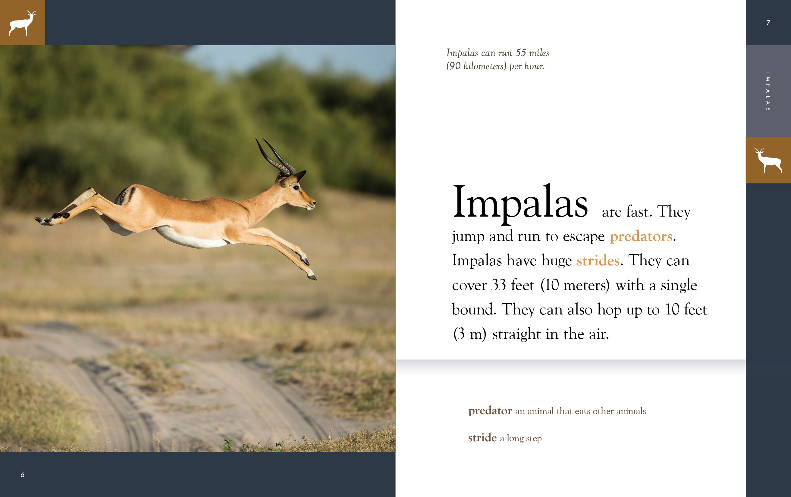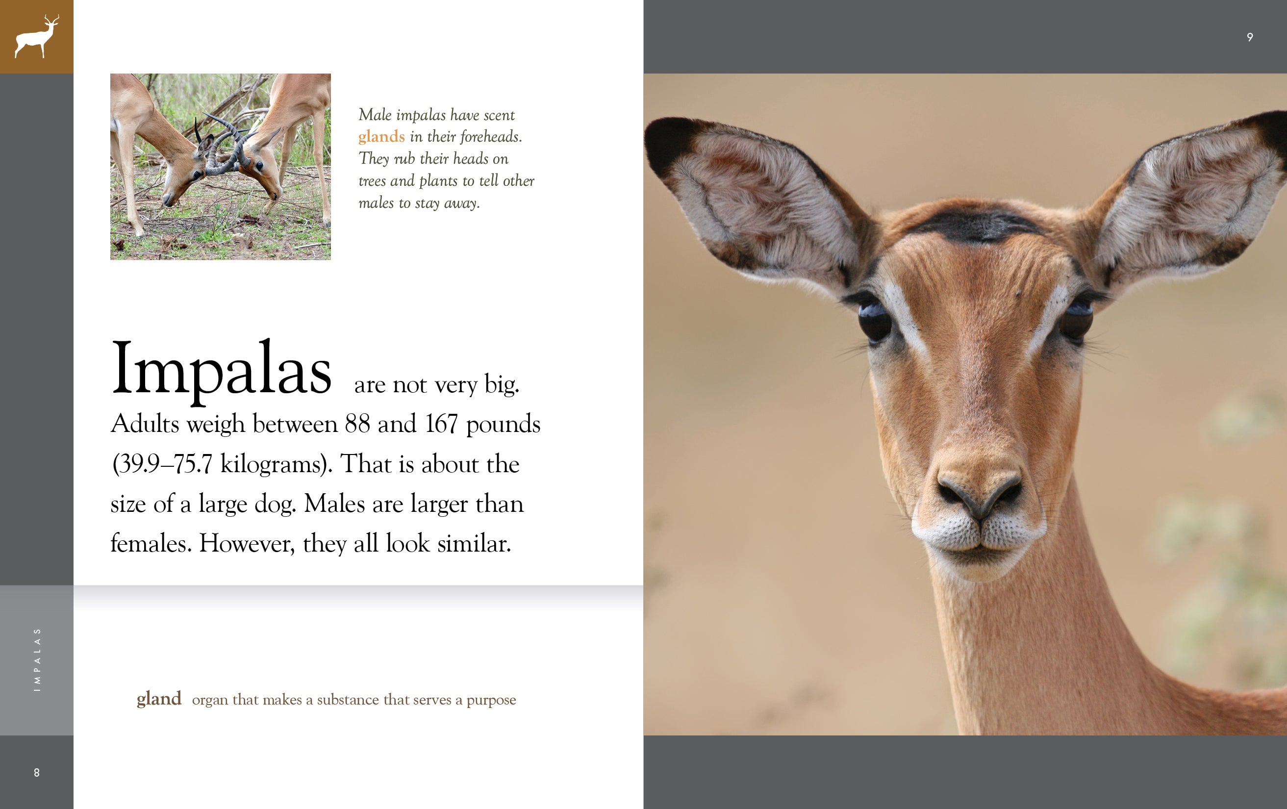 Impalas are known for their speed and agility. This zoology title, filled with beautiful photos and factual life science text, describes these antelopes’ physical characteristics—long legs, long necks, and twisted horns. The text covers impalas’ habitat in eastern and southern Africa, diet, social behaviors, reproductive habits, and life cycle. It includes a cultural story about a mother and baby impala outsmarting a hyena. Part of Creative Education’s popular Amazing Animals series, this book supports elementary-aged readers with captions, on-page definitions, additional resources, and an index.
