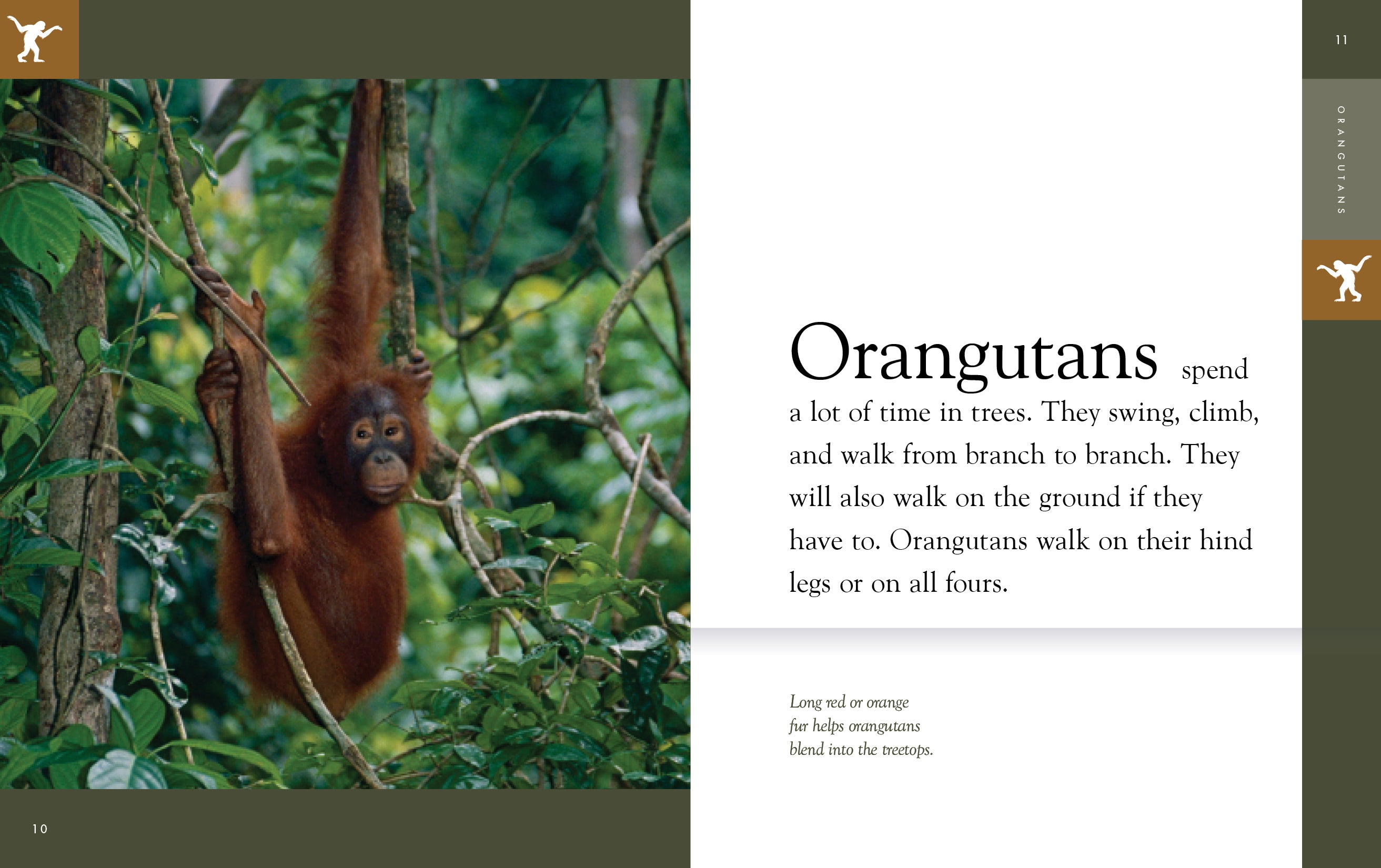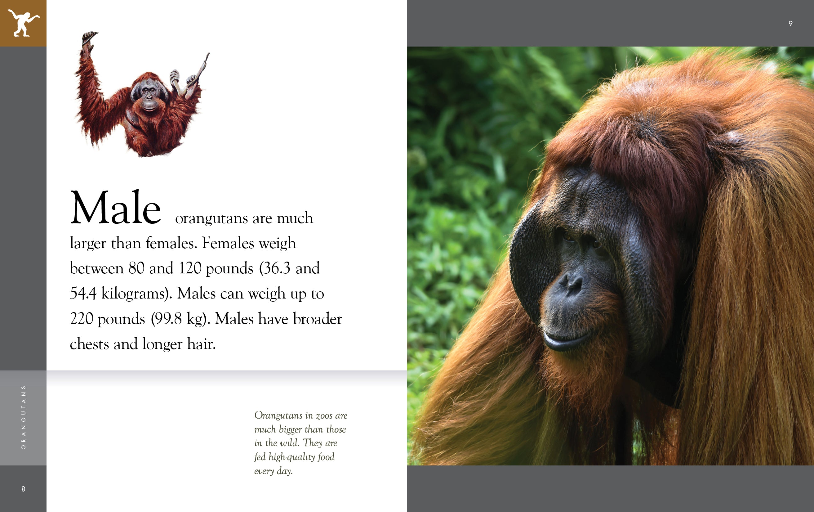 With their long red or orange fur and significant strength, orangutans are fascinating creatures. This zoology title, filled with beautiful photos and factual life science text, provides an engaging overview of these members of the great ape family. It describes their physical characteristics, habitat in Sumatra and Borneo, diet, social behaviors such as their solitary nature and use of tools, reproductive habits, and life cycle. The book includes a cultural story from the Dayak people about the origin of orangutans. Part of Creative Education’s popular Amazing Animals series, it supports elementary-aged readers with captions, on-page definitions, additional resources, and an index.