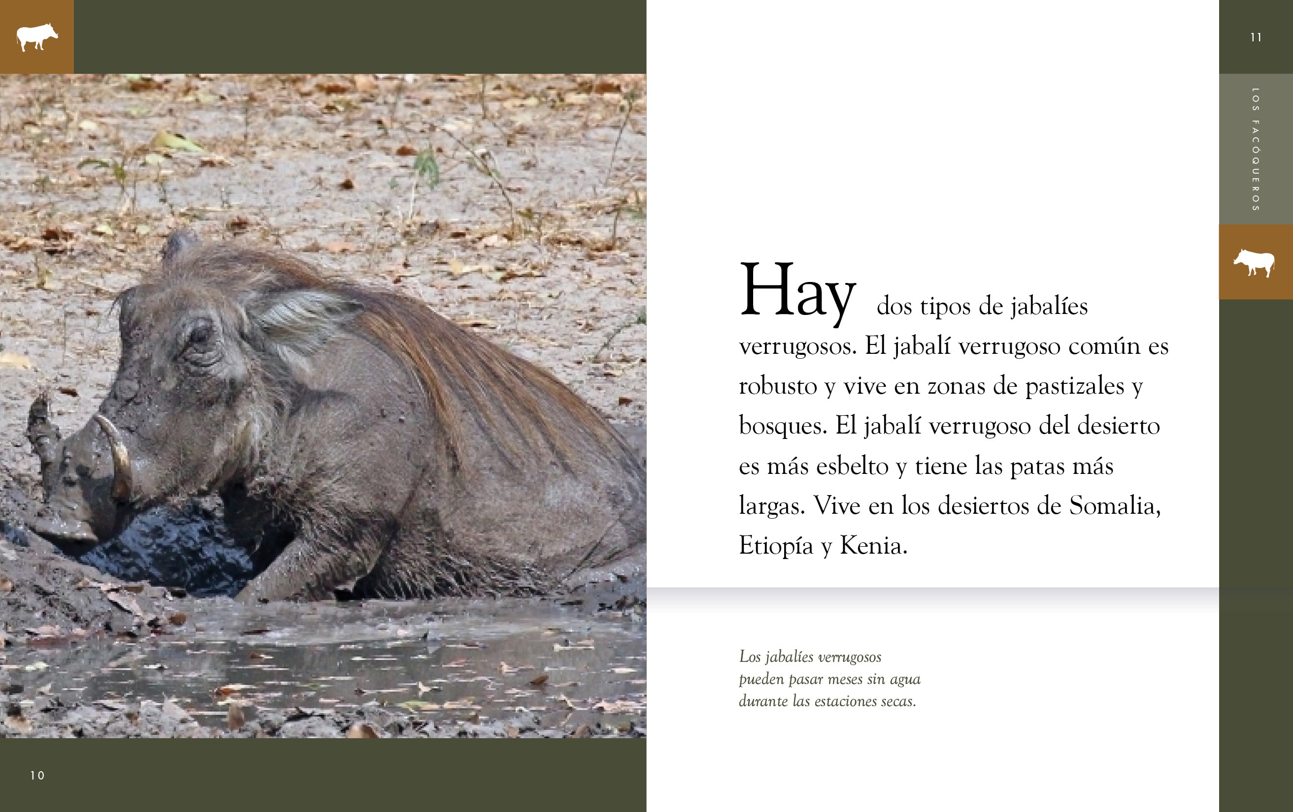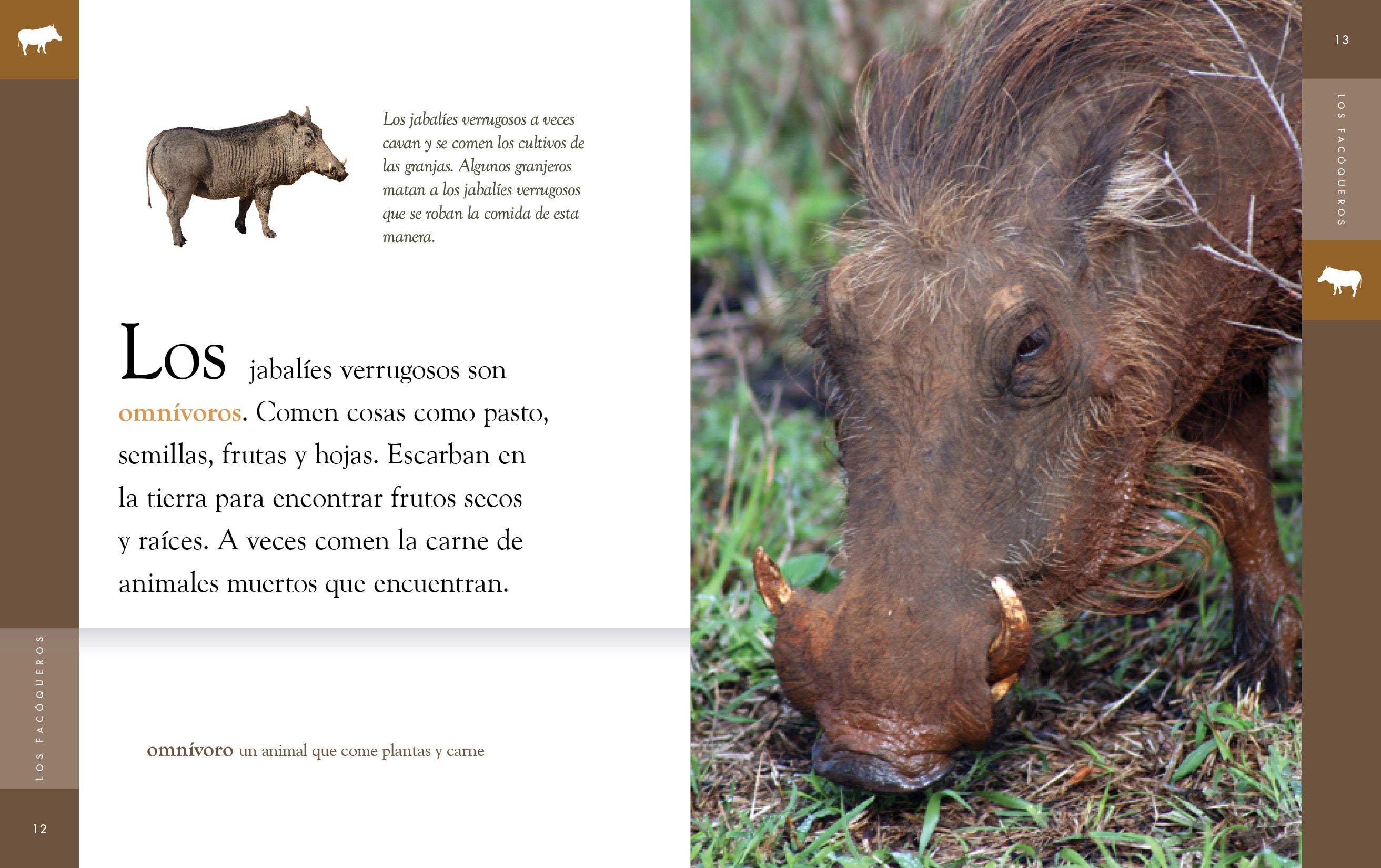 Explora el mundo de los facoceros, los cerdos salvajes nativos del África subsahariana. Este título de zoología, lleno de hermosas fotos y texto científico de vida real, describe las características físicas de estos mamíferos: protuberancias parecidas a verrugas, pelo áspero y grandes colmillos utilizados para cavar y luchar. El texto cubre el hábitat, dieta y comportamientos sociales de los facoceros, incluyendo su papel en el ecosistema y sus interacciones con los depredadores, y explica sus hábitos reproductivos y ciclo de vida. El libro incluye una historia cultural sobre cómo el facocero obtuvo sus protuberancias. Parte de la popular serie Animales Asombrosos de Creative Education, el libro apoya a los lectores de edad escolar primaria con leyendas, definiciones en la página y un índice.
