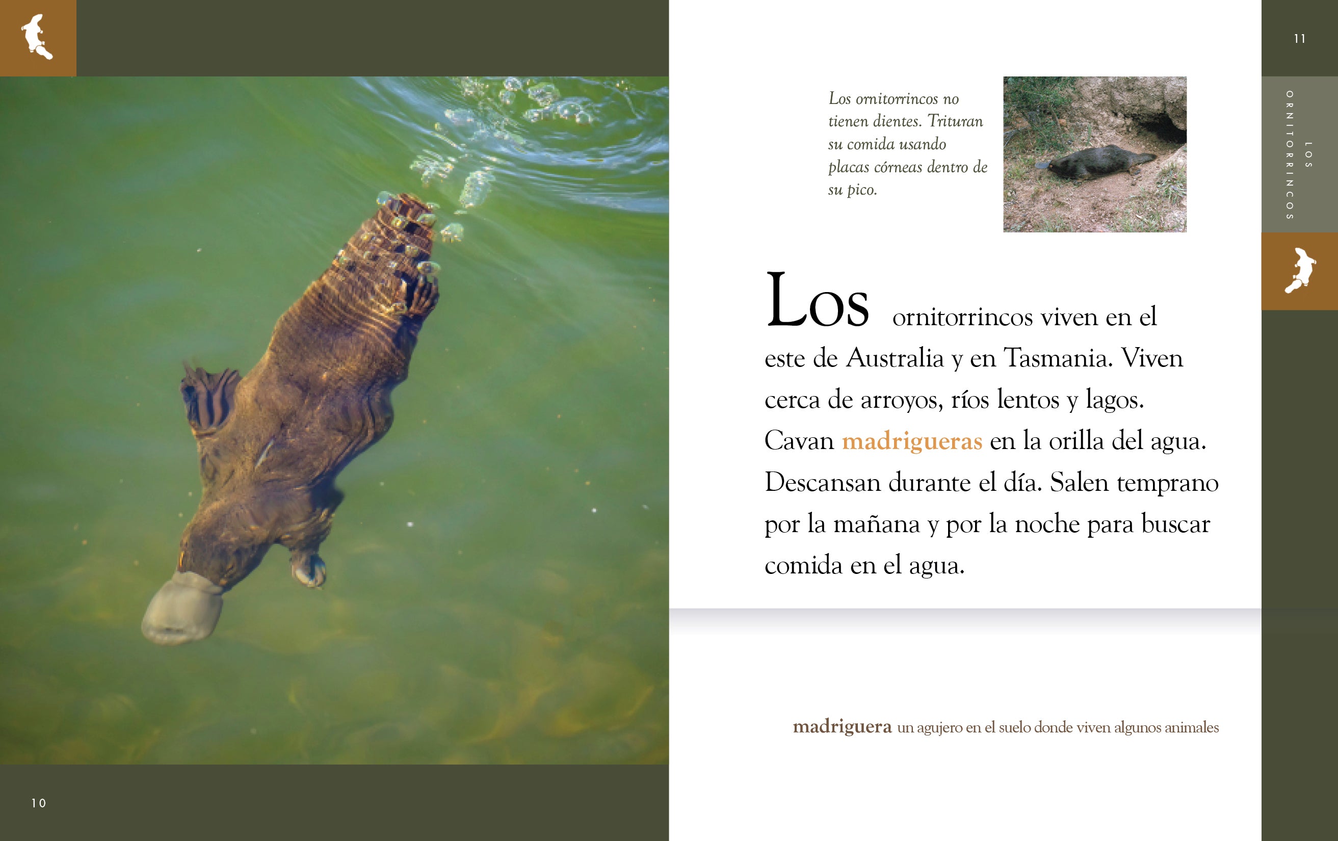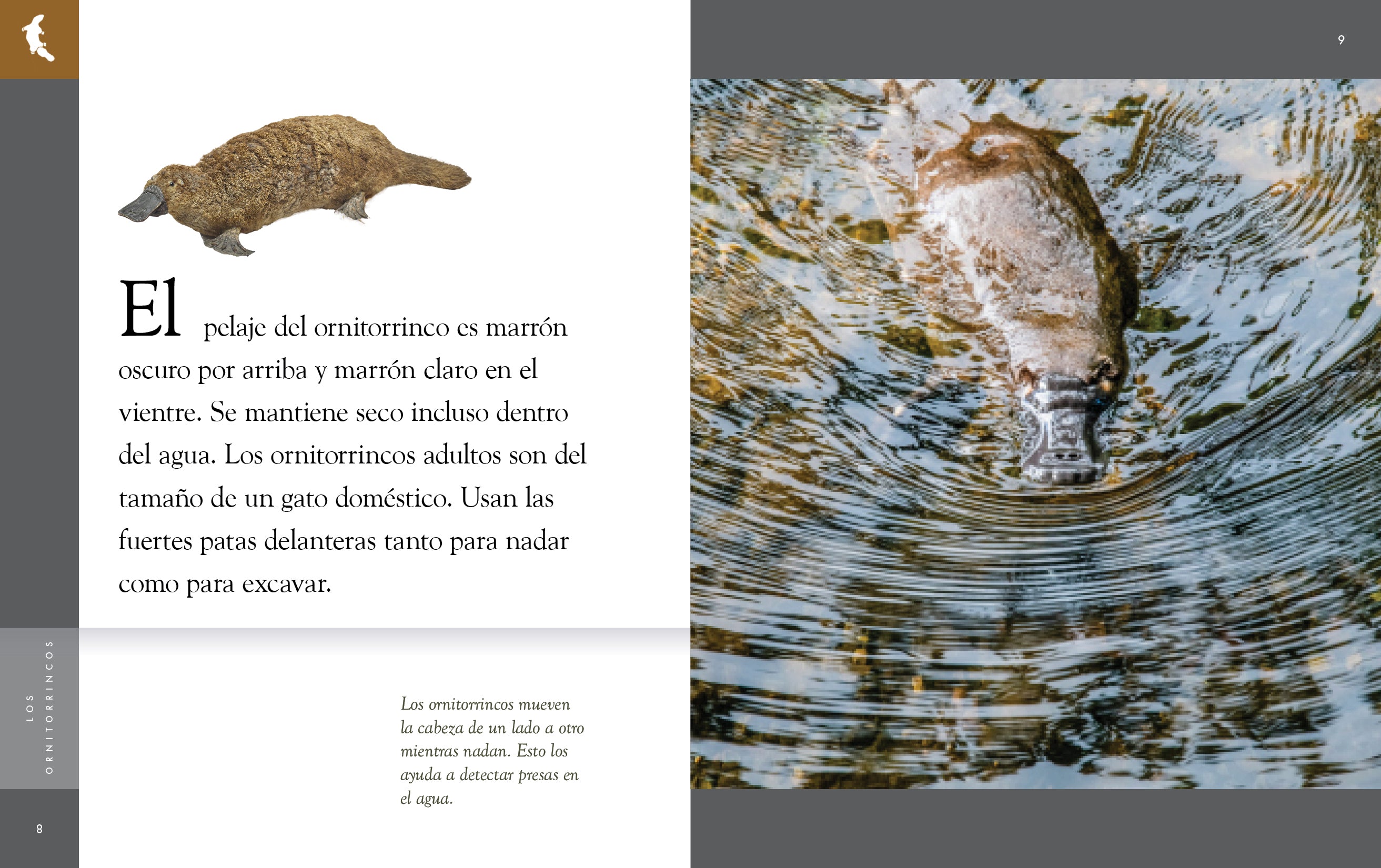 Con su cola plana y su pico parecido al de un pato, el peludo ornitorrinco es una criatura fascinante. Este título de zoología, lleno de hermosas fotos y texto científico de vida real, describe el hábitat de los ornitorrincos en el este de Australia y Tasmania. Explora su dieta, excelentes habilidades para nadar y el uso de sensores en su pico para navegar bajo el agua. El texto explica sus hábitos reproductivos y destaca rasgos únicos como el pelaje que brilla bajo la luz ultravioleta y los espolones venenosos. Se incluye una historia cultural sobre la singularidad del ornitorrinco. Parte de la popular serie Animales Asombrosos de Creative Education, este libro apoya a los lectores de edad escolar primaria con leyendas, definiciones en la página y un índice.