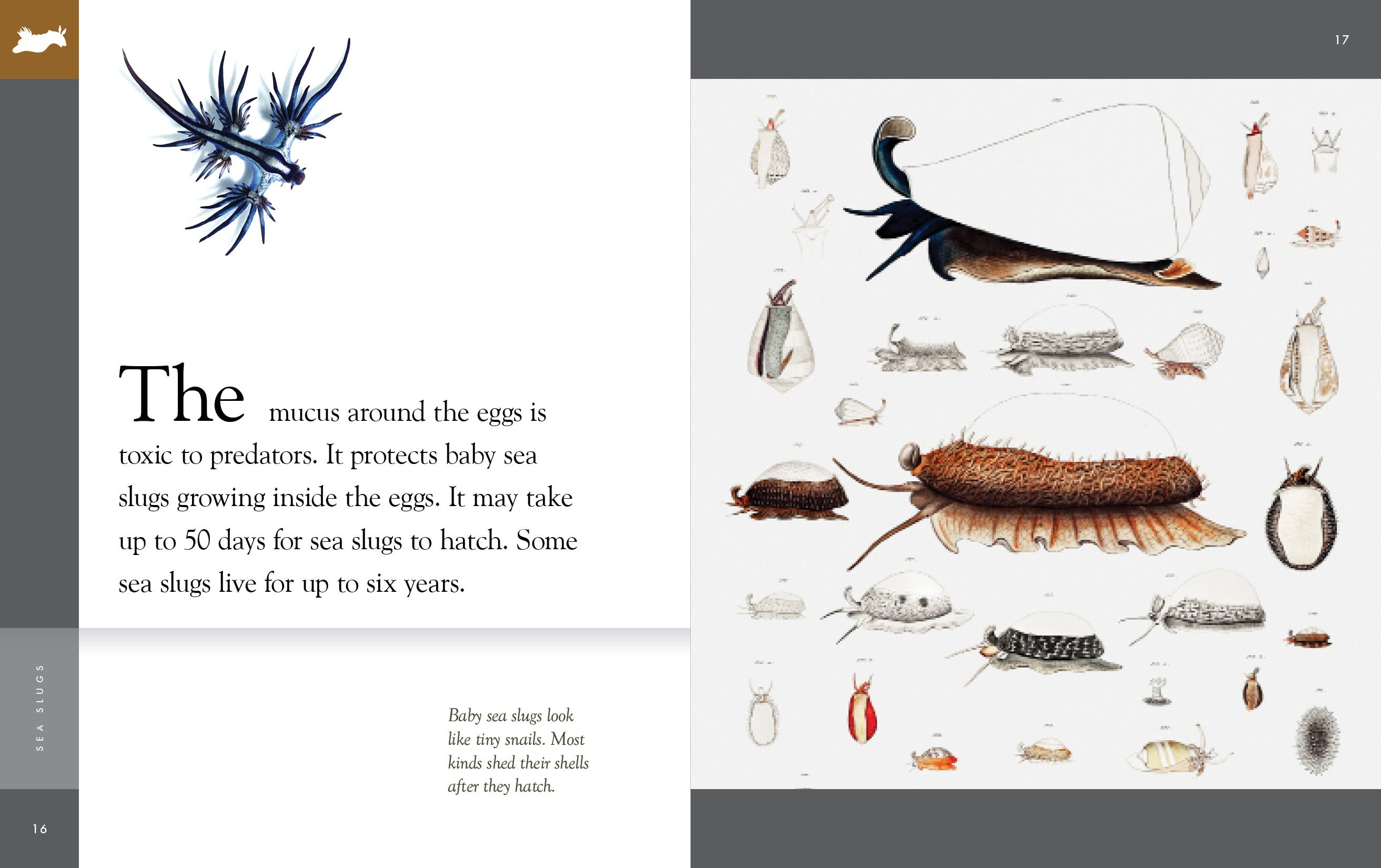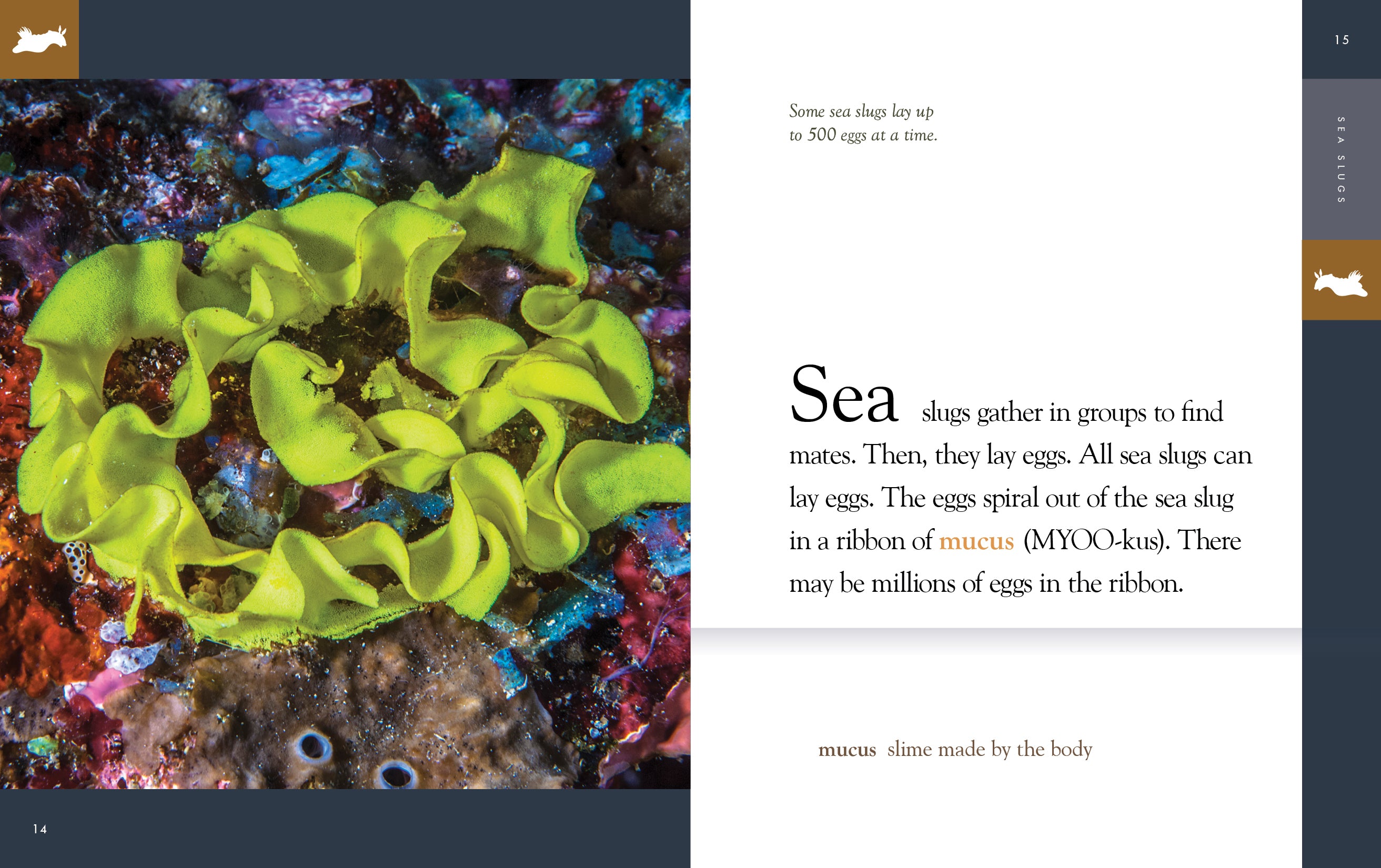 Explore the diverse and fascinating world of sea slugs with this zoology title, filled with beautiful photos and factual life science text. The book describes various types of sea slugs, including white bubble snails and Spanish dancers, highlighting their unique features and vibrant colors. It covers sea slugs’ habitat, diet, reproductive habits, and behaviors such as the ability to steal toxins from prey. A cultural story about the popularity of sea slugs in Japanese media is included. Part of Creative Education’s popular Amazing Animals series, this book supports elementary-aged readers with captions, on-page definitions, additional resources, and an index.