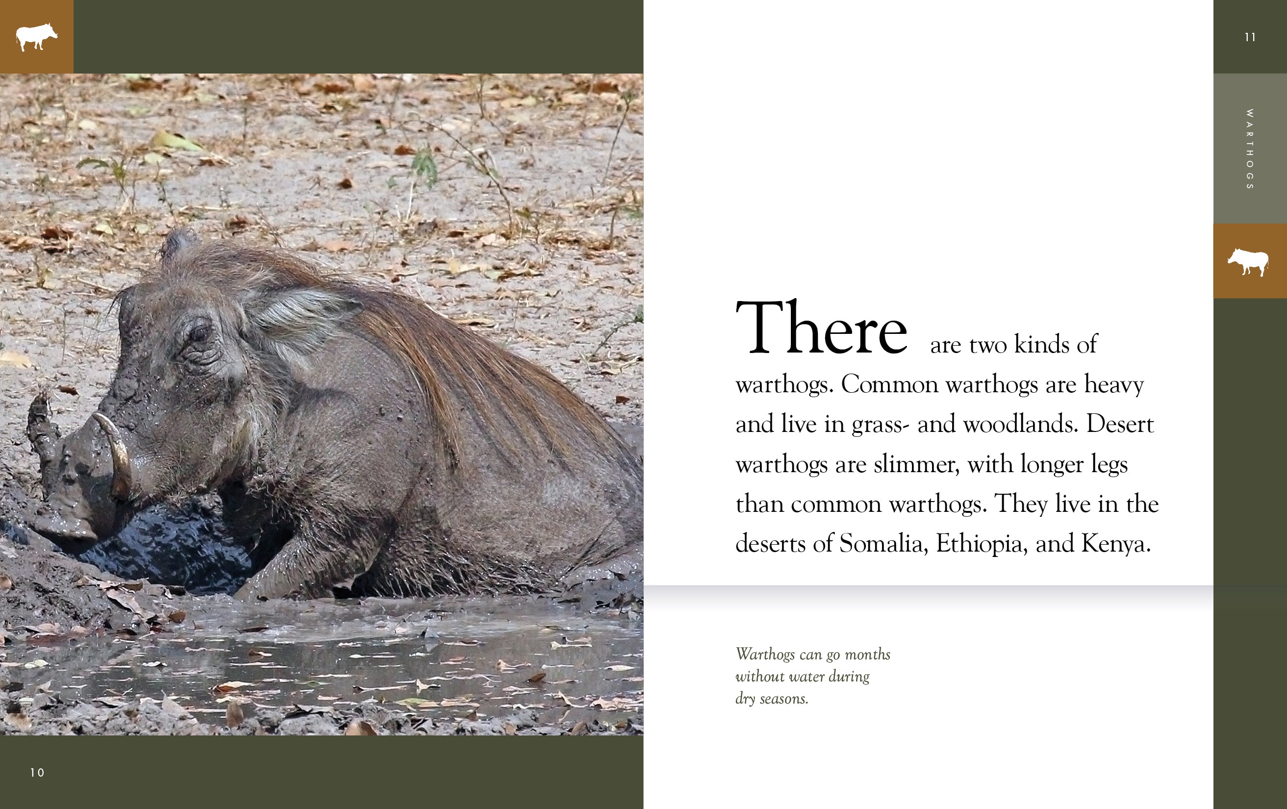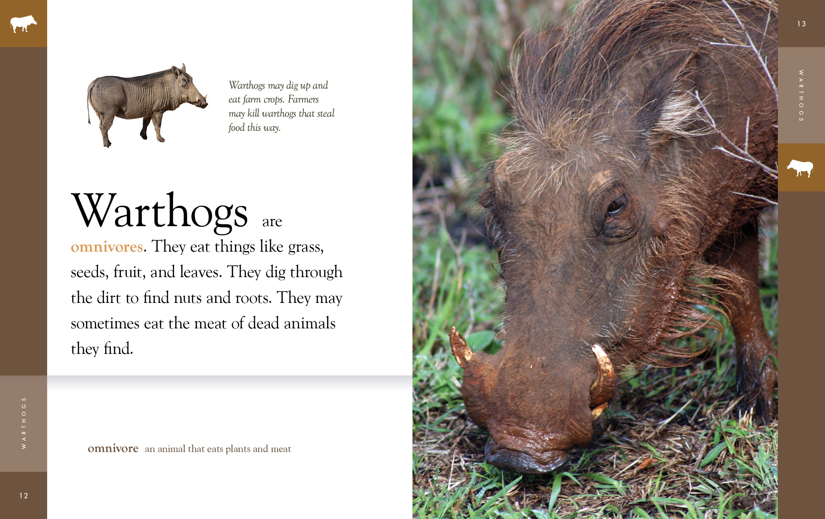 Explore the world of warthogs, the wild pigs native to sub-Saharan Africa. This zoology title, filled with beautiful photos and factual life science text, describes these mammals’ physical characteristics—wart-like bumps, coarse hair, and large tusks used for digging and fighting. The text covers warthogs’ habitat, diet, and social behaviors, including their role in the ecosystem and interactions with predators, and explains their reproductive habits and life cycle. The book includes a cultural story about how the warthog got its lumps. Part of Creative Education’s popular Amazing Animals series, the book supports elementary-aged readers with captions, on-page definitions, additional resources, and an index.