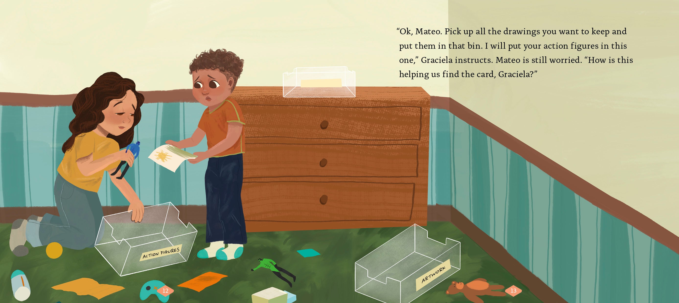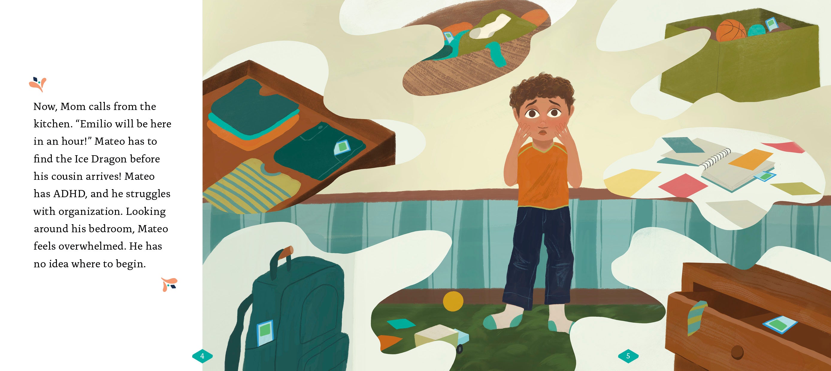Mateo is panicking because he can't find his cousin Emilio's favorite card, the Golden Dragon, which he borrowed. With ADHD, Mateo struggles with organization and feels overwhelmed. His sister Graciela steps in to help, bringing clear plastic totes to sort his things. As they organize, Mateo discovers the card hidden in a coloring book. Graciela teaches Mateo a new system to keep important items safe. When Emilio arrives, Mateo proudly returns the card, ready for their next adventure. This story encourages understanding and acceptance of children with ADHD, essential for social-emotional learning (SEL). Includes a glossary of important words and tips for staying organized.