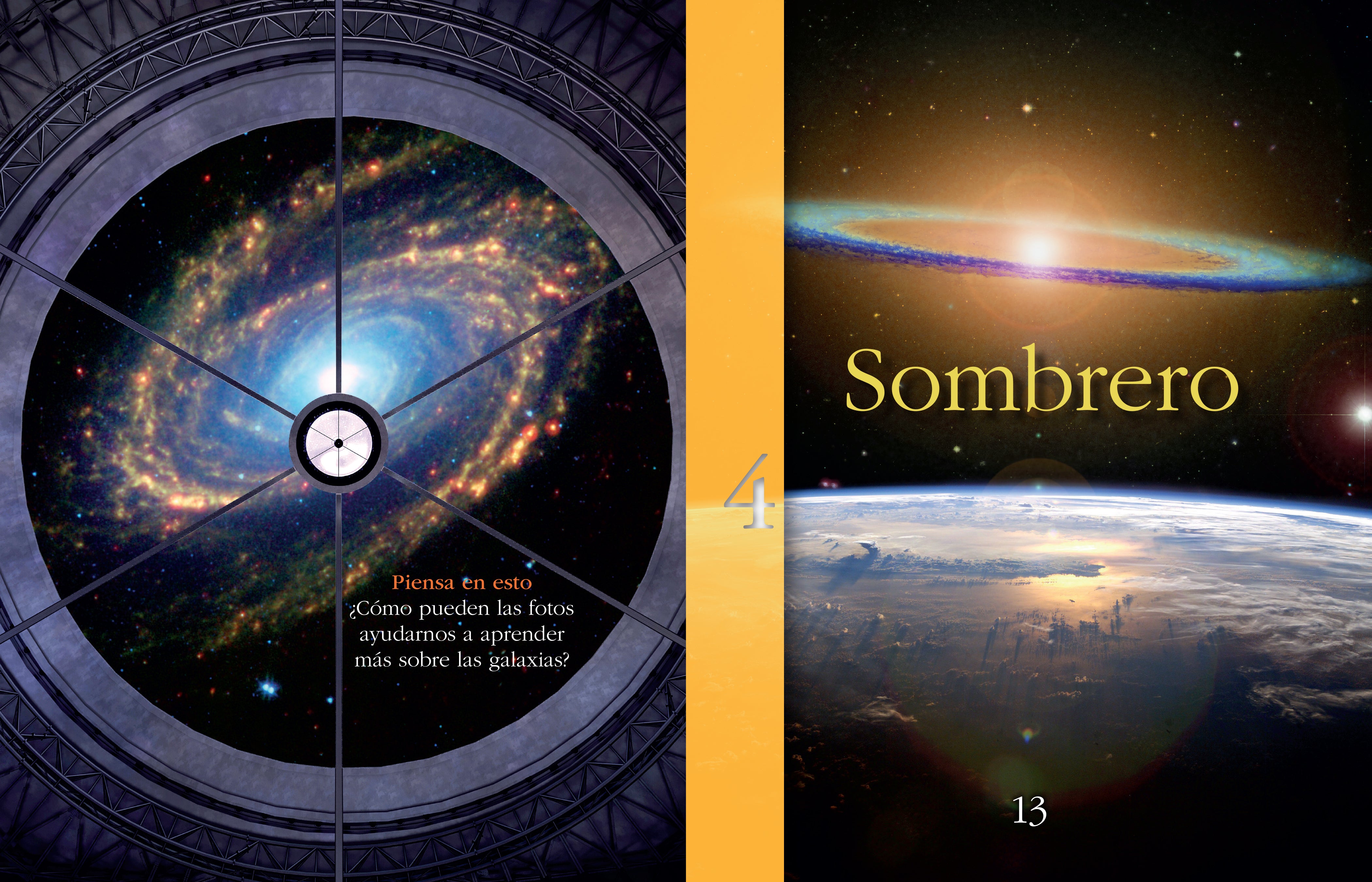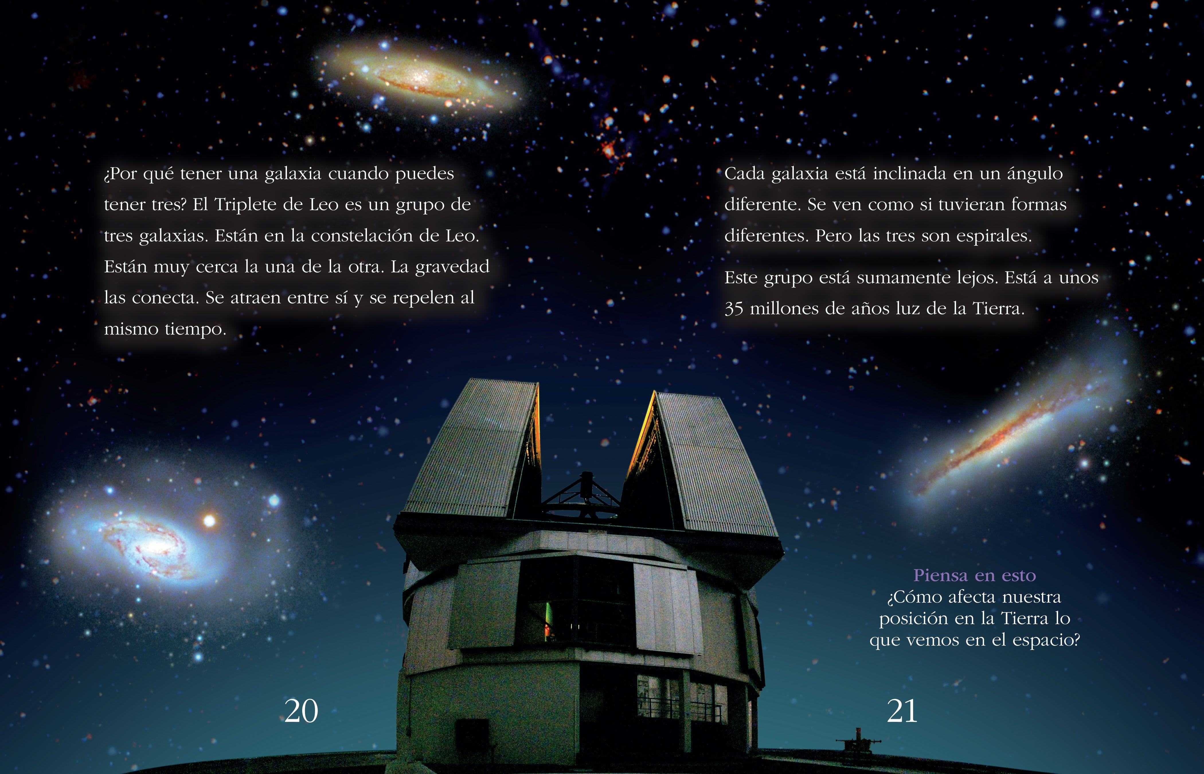 El diseño de la disposición intrigante presenta imágenes impresionantes, datos fascinantes, indicaciones de 'Piensa en ello' y un mapa de galaxias. Incluye una tabla de contenido, un glosario y un índice.