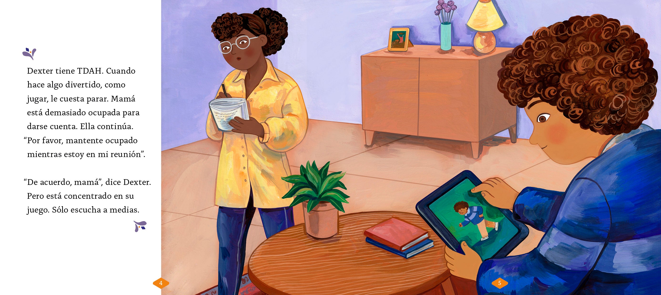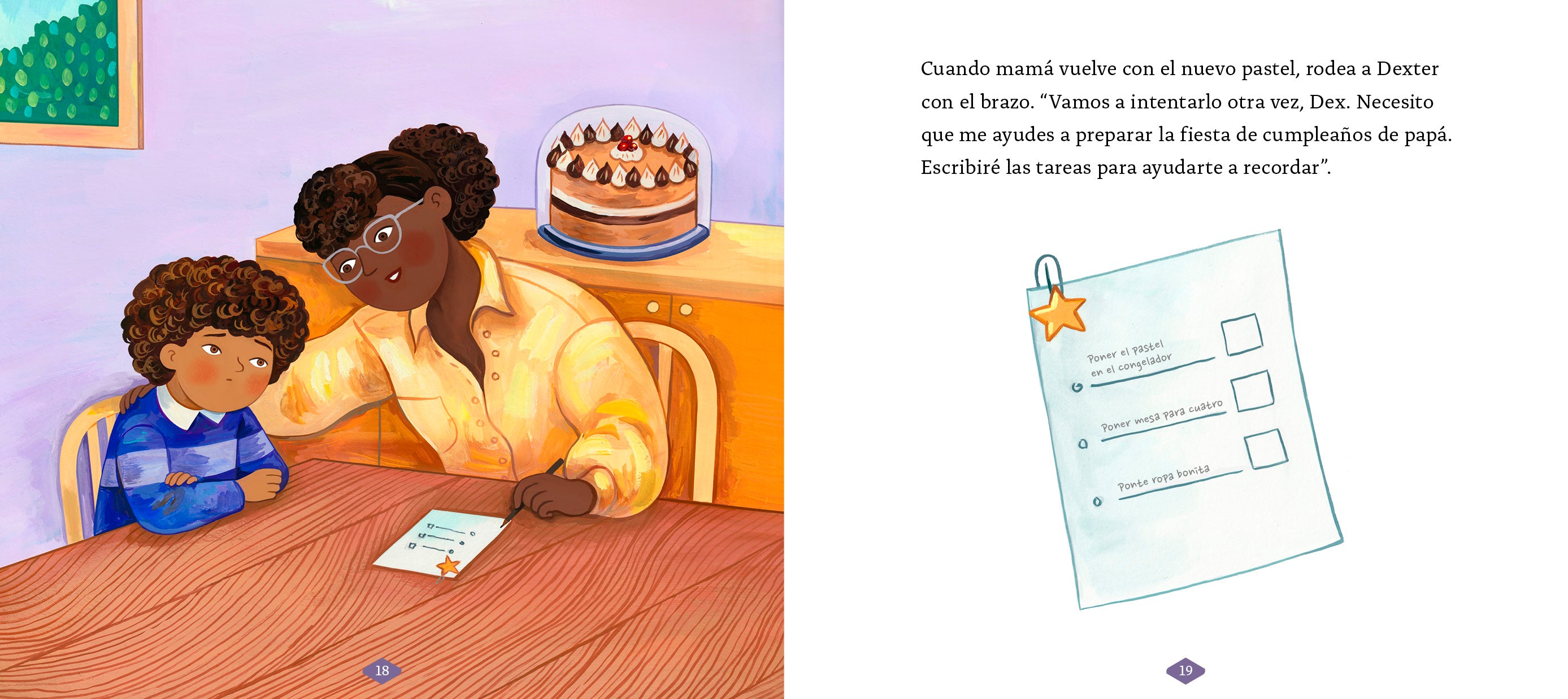 Dexter, un niño con TDAH, tiene dificultades para seguir las instrucciones de su mamá mientras juega su juego favorito. Olvida poner el pastel de cumpleaños de su papá en el congelador, lo que hace que se derrita. Sintiendo terrible, Dexter aprende a manejar sus distracciones escribiendo las tareas y guardando su tableta. Con la ayuda de su mamá, Dexter completa con éxito sus tareas y disfruta de la celebración de cumpleaños, aprendiendo valiosas lecciones sobre concentración y responsabilidad. Esta historia fomenta la comprensión y aceptación de los niños con TDAH, esenciales para el aprendizaje socioemocional (SEL). Incluye un glosario de palabras importantes y consejos para escuchar y seguir instrucciones.