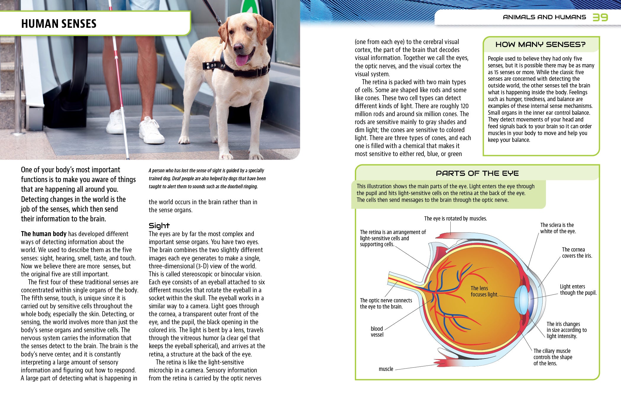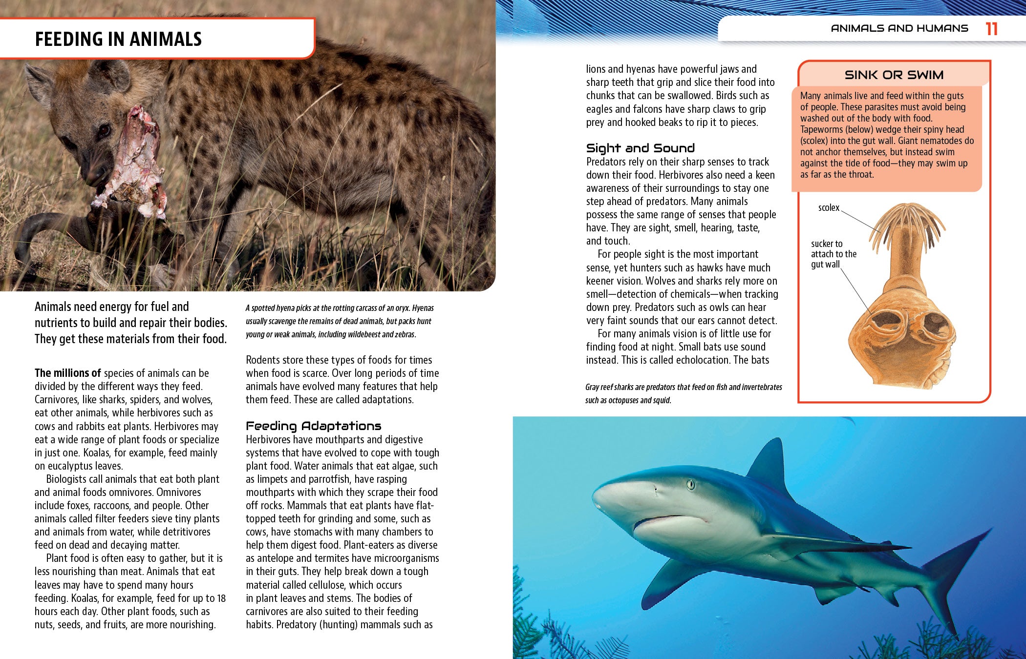 Biologists divide living things into groups called kingdoms. This book looks at animals: the life-forms that make up the animal kingdom. Animals vary in body structure, feeding habits, reproduction, and behavior. But all are multicellular organisms. All have to eat to get energy, and most have a nervous system that allows them to respond to challenges in their environment.