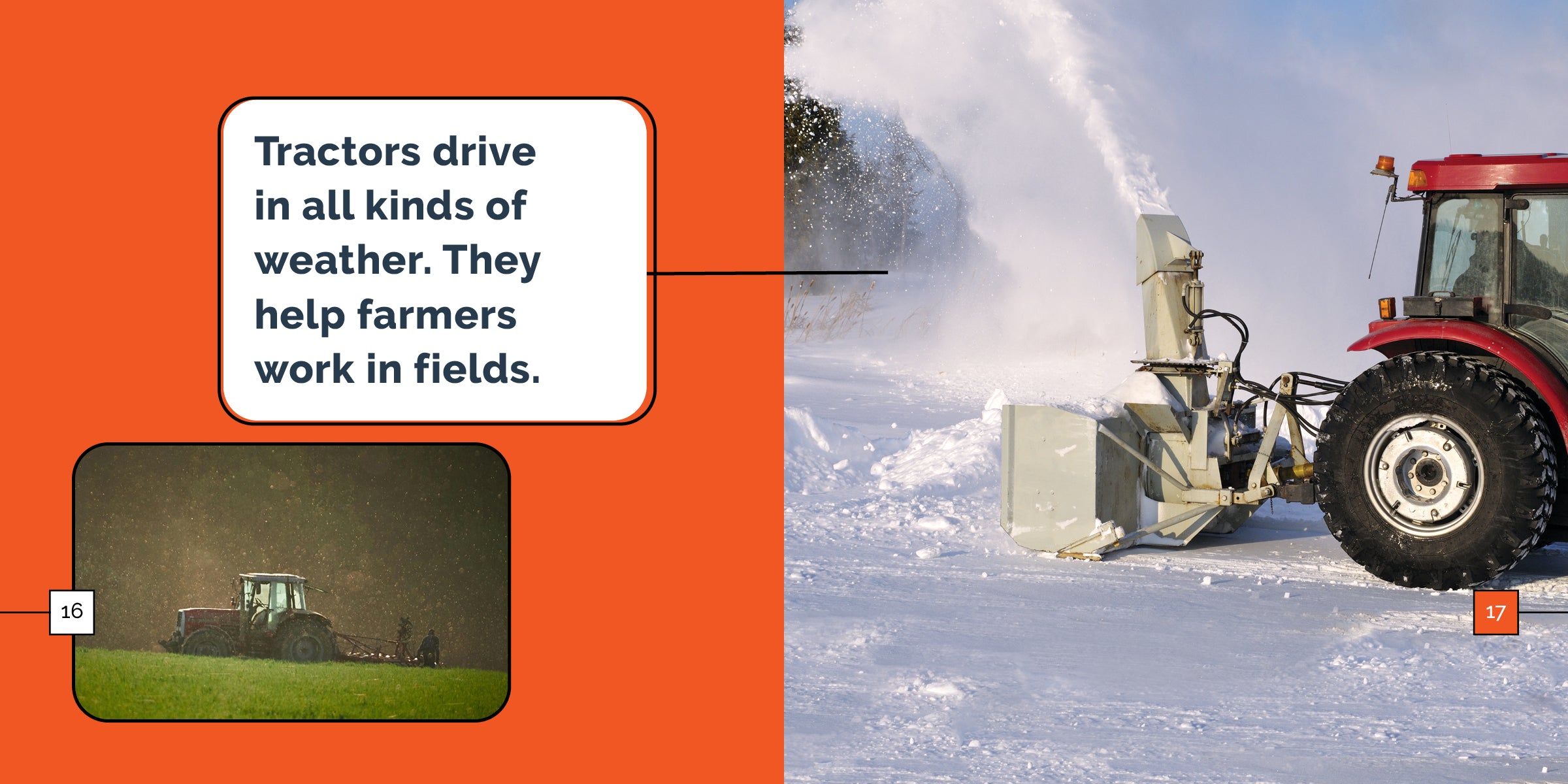 Nothing gets the job done like a powerful, multi-purpose tractor! This agriculture book introduces beginning readers to farm machines that can push and pull heavy equipment. Aided by eye-catching photographs, fun facts, and comic-inspired speech bubbles and humor, kids will learn about tractors, their purpose, parts, role in farming, and defining features such as their big tires. A labeled diagram reinforces visual learning and enhances comprehension. Includes a glossary, index, and recommended books and websites